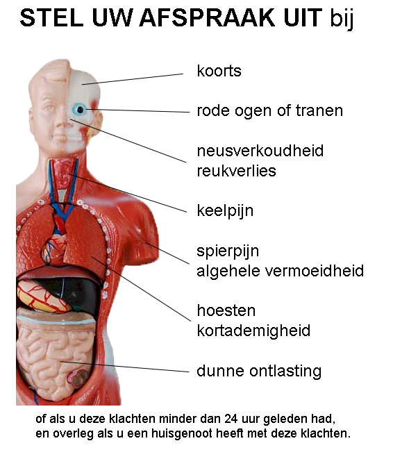 Mocht u één van de genoemde klachten hebben, of daar minder dan 24 uur van af zijn, dan moet u uw afspraak verzetten. Ik zal personen die tekenen van een infectie vertonen en op mijn spreekuur komen, niet behandelen en naar huis sturen.
